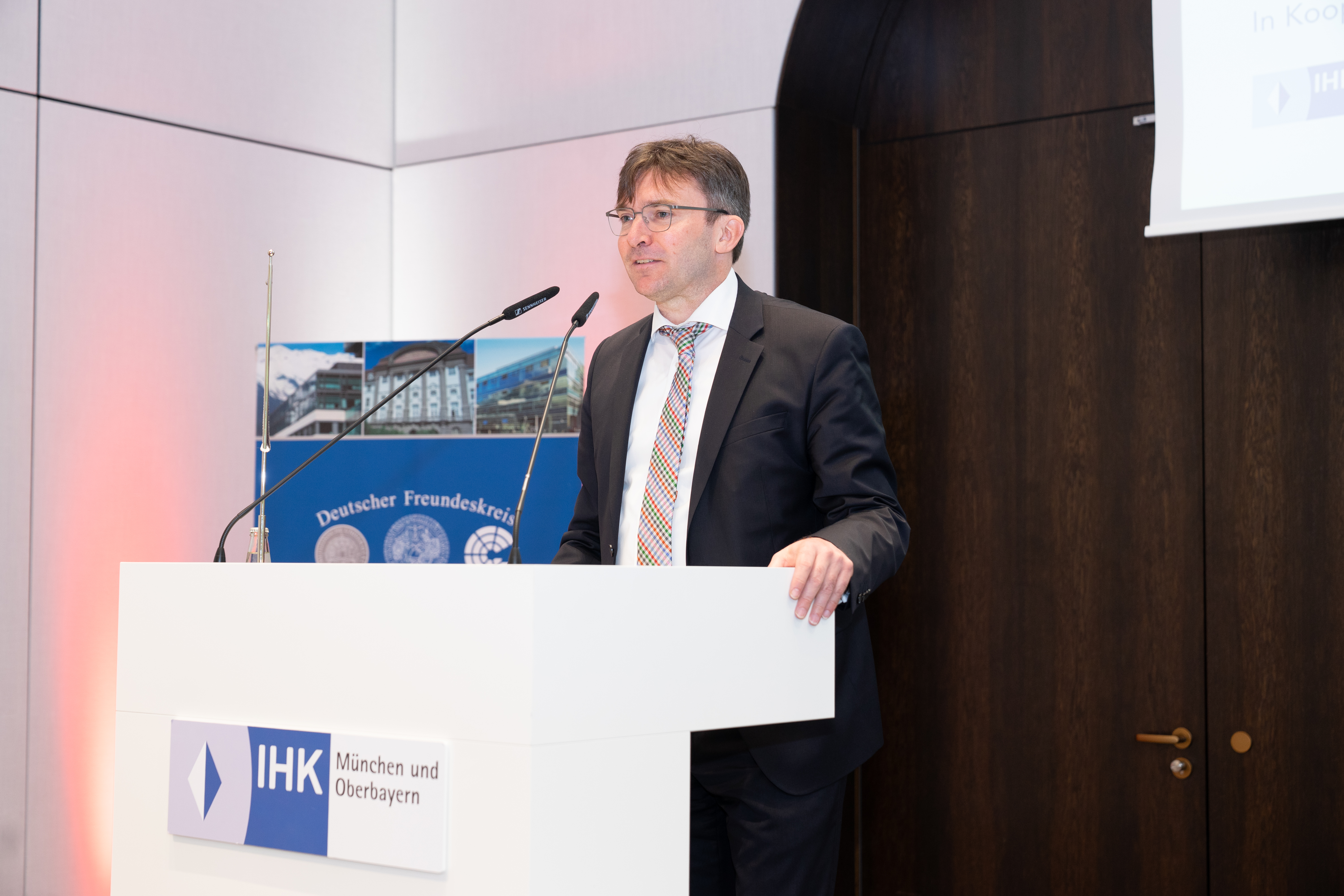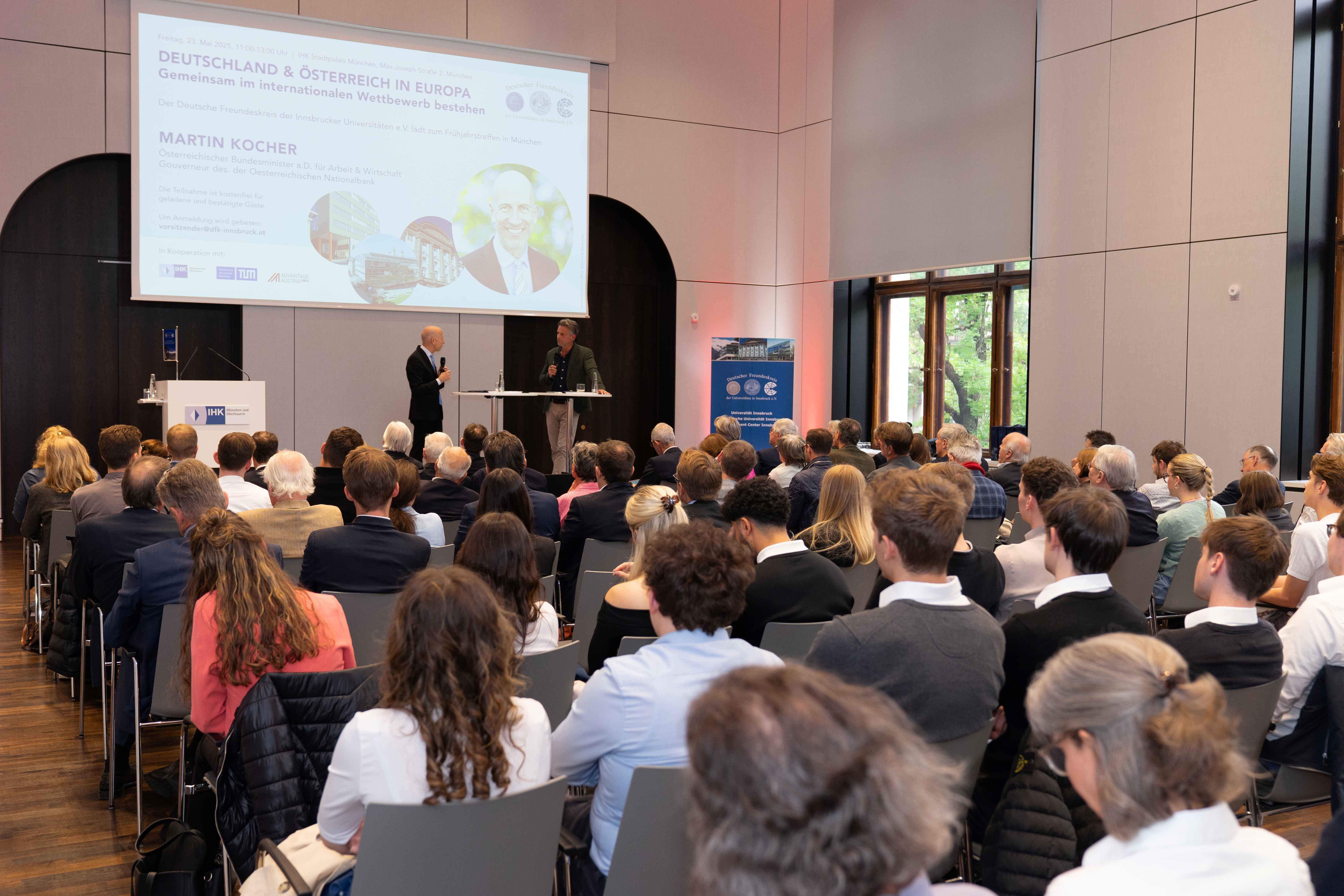 Konnten bereits in den letzten Jahren klangvolle Namen wie die österreichischen Regierungsmitglieder Magnus Brunner, Alexander Schallenberg, Sebastian Kurz, Reinhold Mitterlehner, Karlheinz Töchterle, Hans Jörg Schelling oder Landeshauptmann Günther Platter als ranghohe Persönlichkeiten begrüßt werden, so stand diesmal der ehemalige österreichische Arbeits- und Wirtschaftsminister und designierte Gouverneur der Oesterreichischen Nationalbank Martin Kocher  zum Thema „Deutschland & Österreich in Europa. Gemeinsam im internationalen Wettbewerb bestehen“ im Mittelpunkt einer glanzvollen Veranstaltung, die vom DFK-Vorsitzenden Markus Walzl und dem Präsidenten der IHK München & Oberbayern, Klaus-Josef Lutz, in launigen Worten eingeleitet wurde. Die Podiumsdiskussion wurde kompetent moderiert von Oliver Stock, Herausgeber und Chefredakteur von Business Punk (Weimer Gruppe).